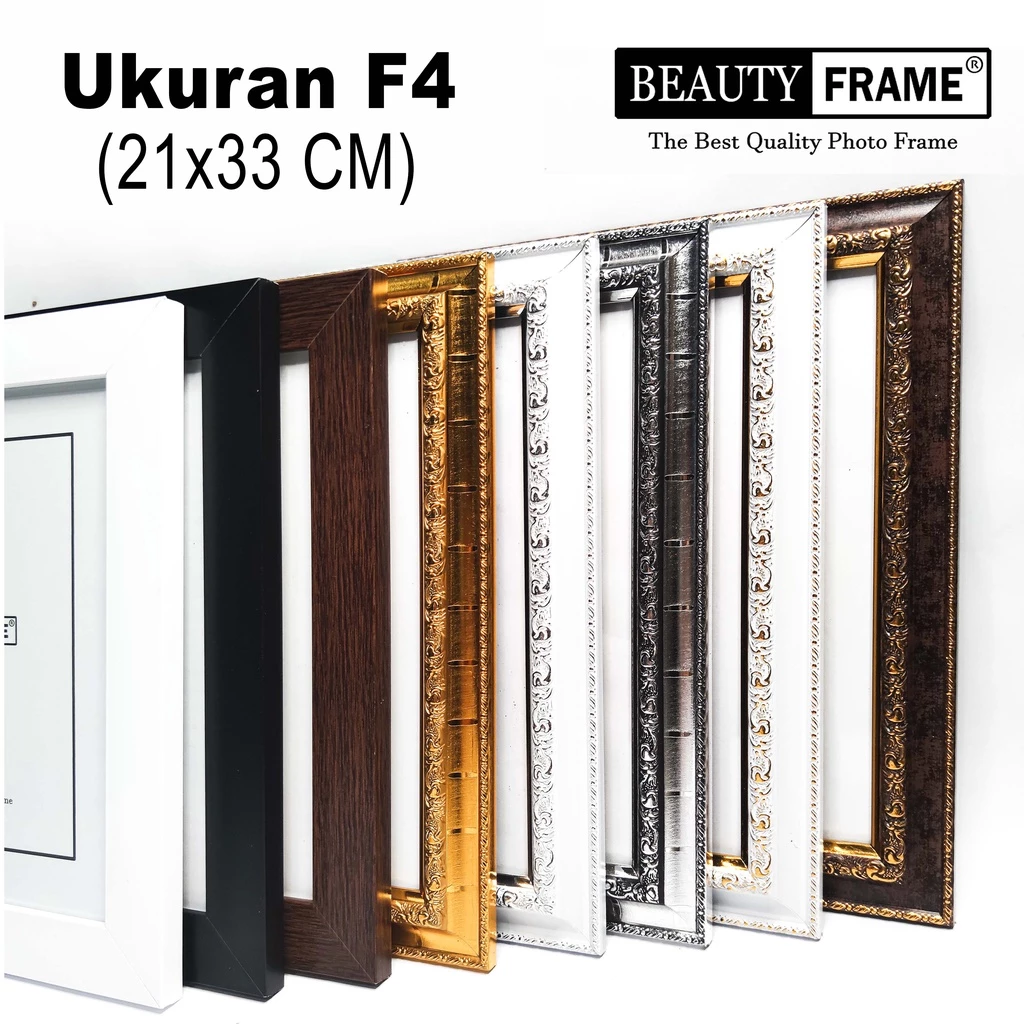 Beauty Frame ukuran F4 21×33 cm cocok untuk piagam dan sertifikat. Termasuk kaca, bisa portrait atau landscape, pilihan motif minimalis dan ukir elegan.